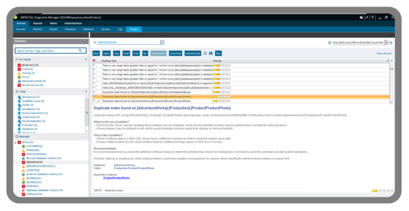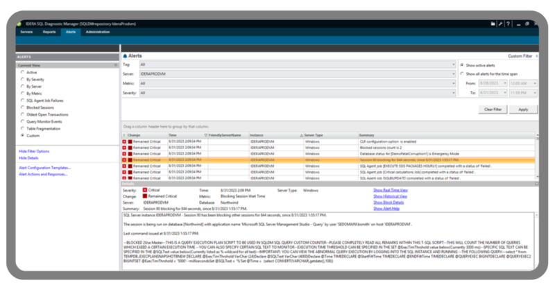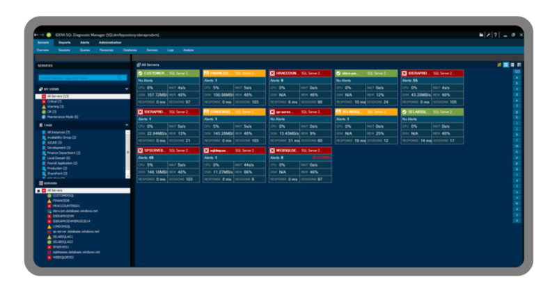 IDERA SQL Diagnostic Manager for SQL Server, SQL Server ortamınız için uçtan uca performans izleme, uyarı, tanılama ve raporlama sağlayan kurumsal bir çözümdür. Fiziksel, sanal ve bulut ortamlardaki SQL Server instancelarını tek konsoldan izleyebilirsiniz.